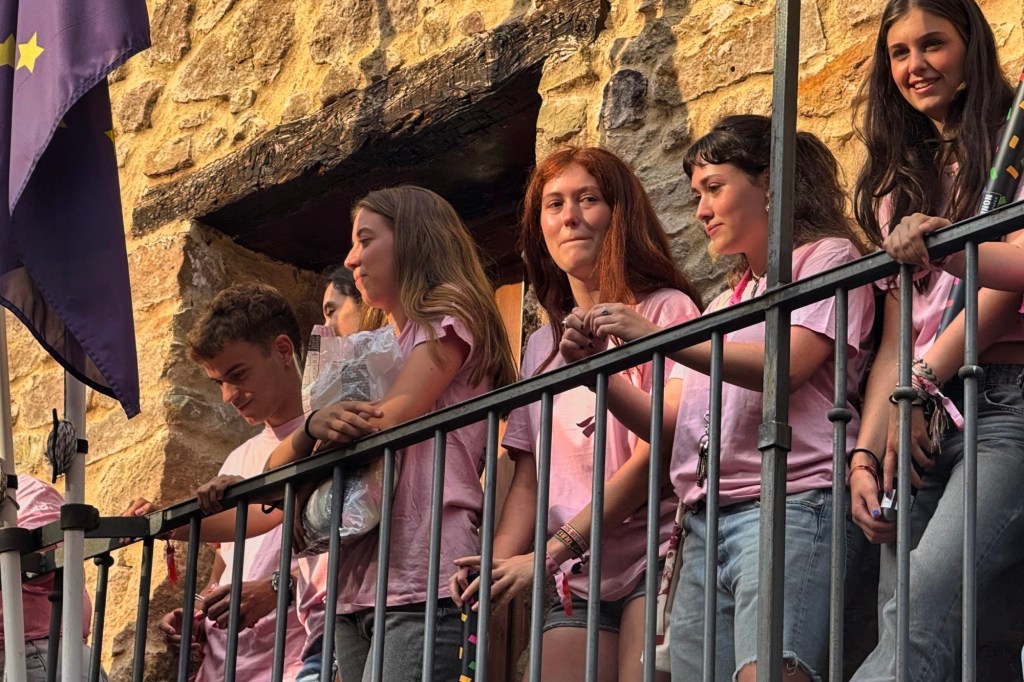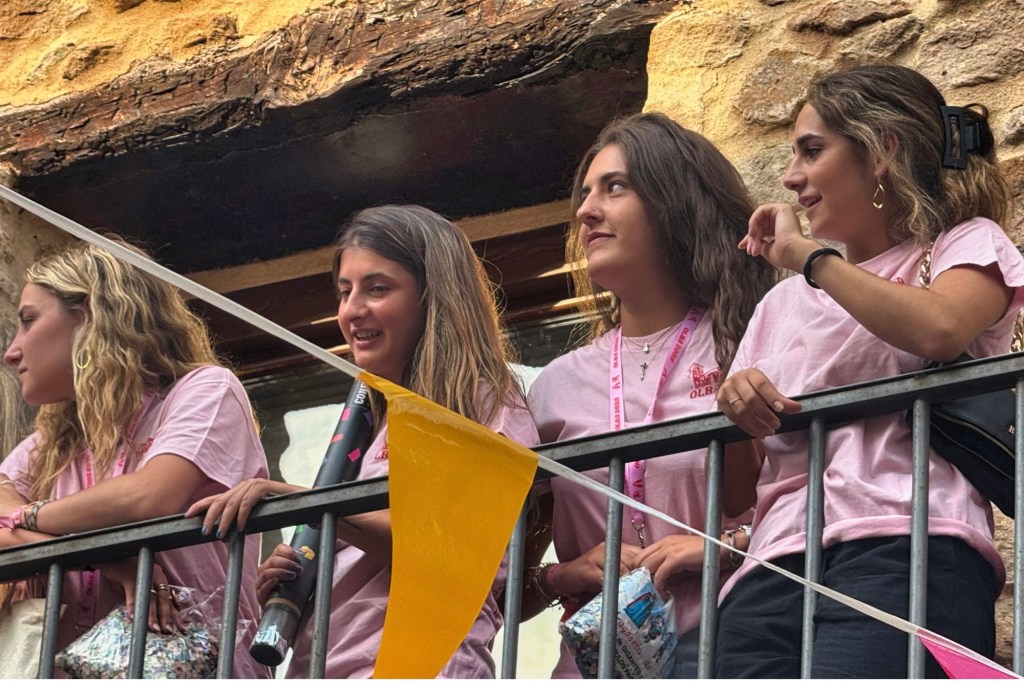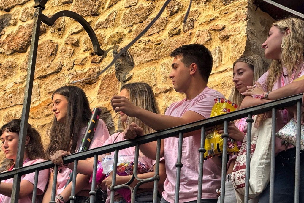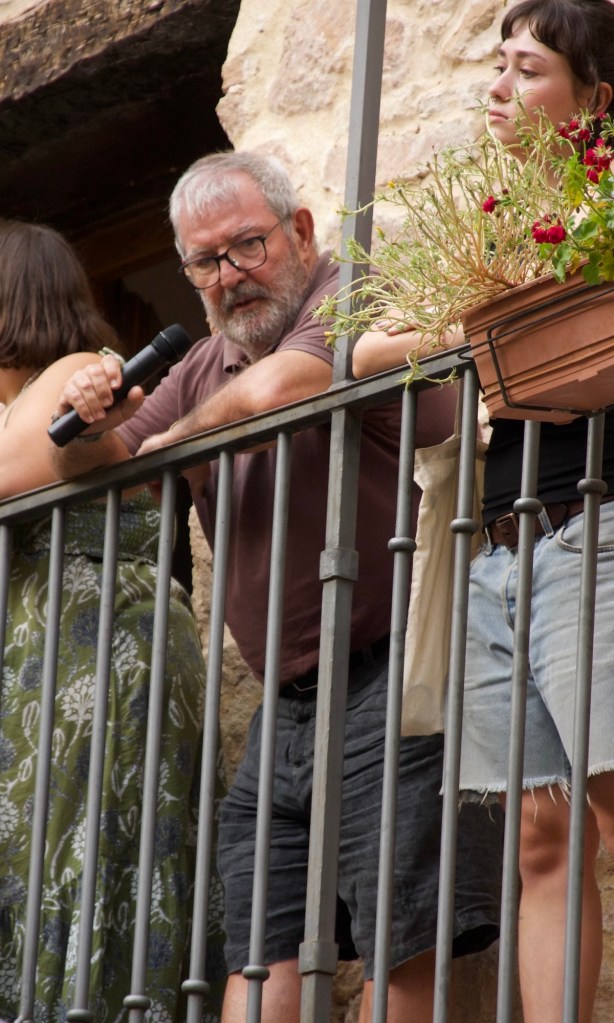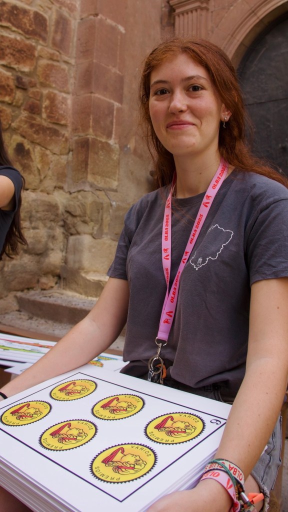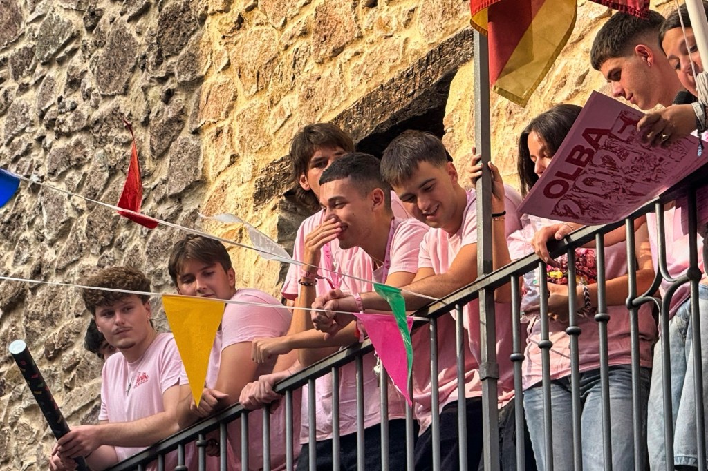 Una vez ya vendido la mayoría del merchandising y ya ataviados con las nuevas camisetas rosas en su mayoría ( había también una de color negro ) comenzó el pregón con la comisión en pleno en el balcón consistorial para darnos un mensaje lleno de buenas intenciones e ilusión para ya una vez declaradas como iniciadas las fiestas de forma oficial con el “viva Olba! “ se diera paso al pasacalles con la charanga , San Usebio y Catalina .