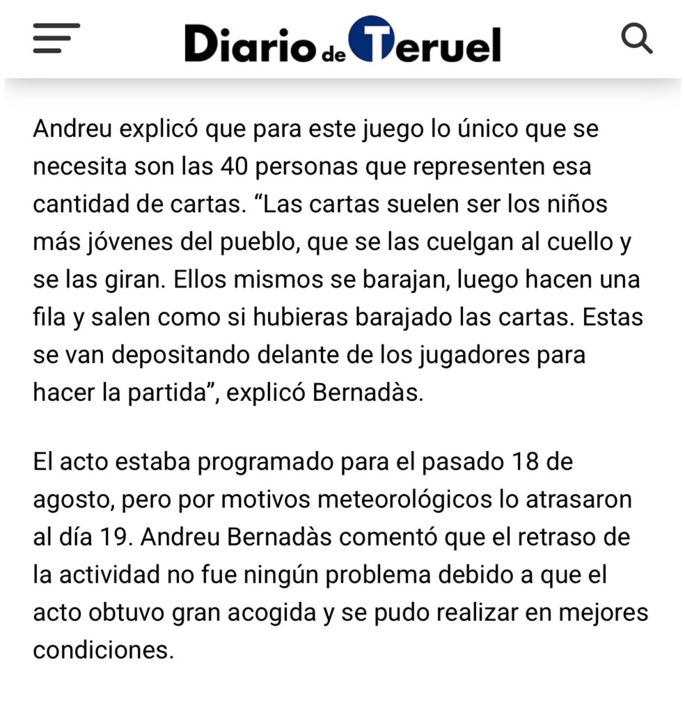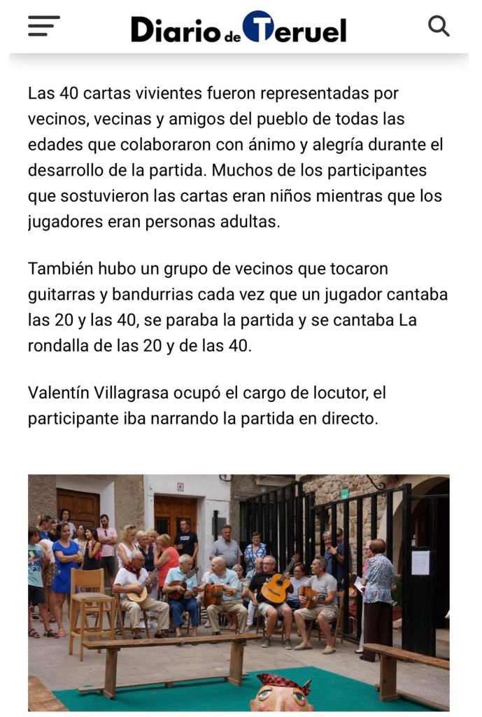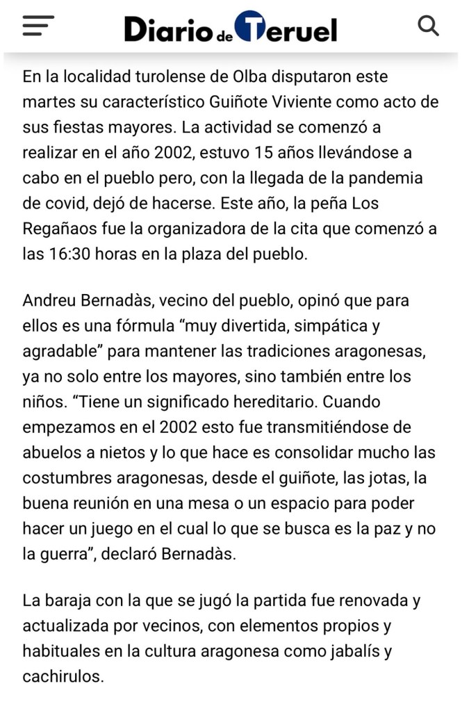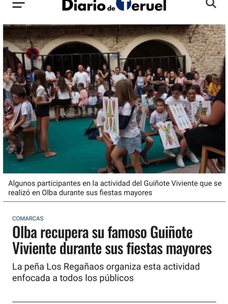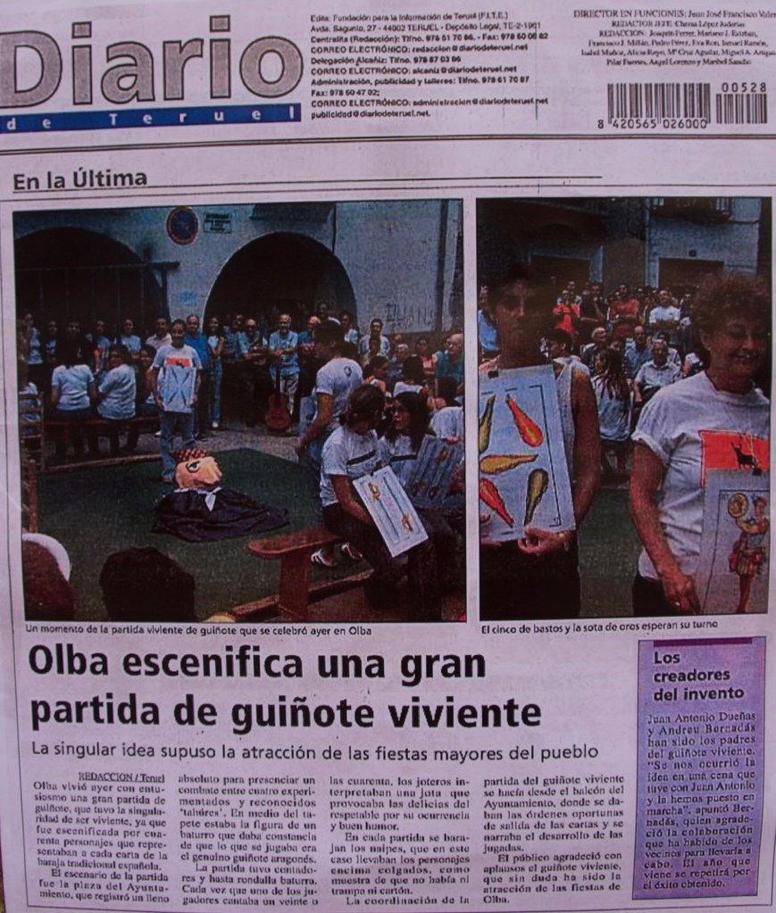 Volver a ver el guiñote viviente en Olba me hizo viajar al pasado , al año 2002. Aquel año , no contábamos con ir al pueblo porque mi padre estaba en pleno tratamiento de su cáncer y nos dieron permiso de cinco días y pudo participar el primer guiñote . Fue increíble y recordarlo o ver fotos de las ediciones 2002 o 2003 ,simplemente emocionante. Gracias Regañaos por recuperarlo y gracias Andreu por aquella gran idea y desde la distancia gestionar el impacto del evento en los medios , Aragon TV y diario de Teruel donde pude aportar con mis fotografías en el reportaje publicado en éste .
