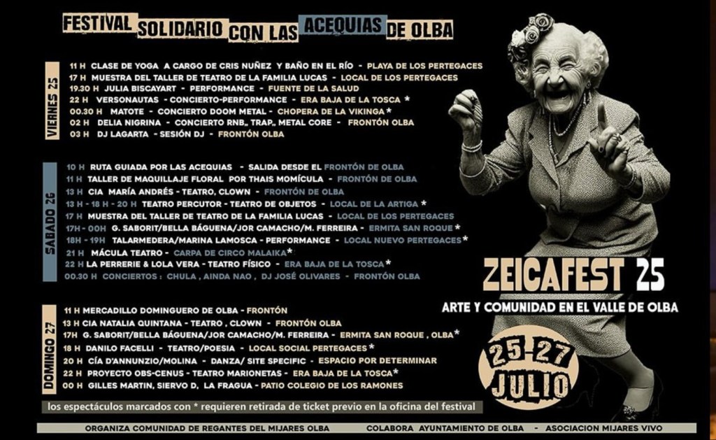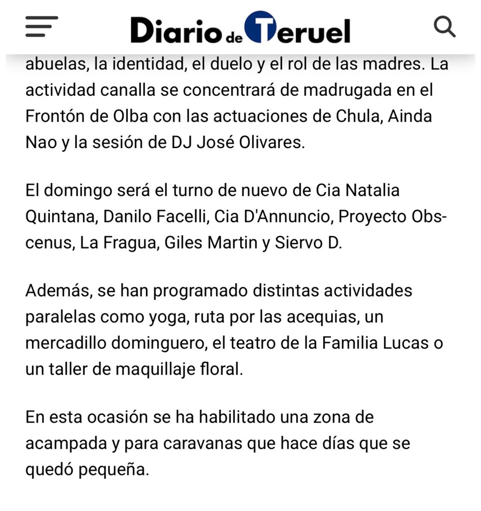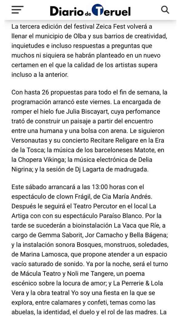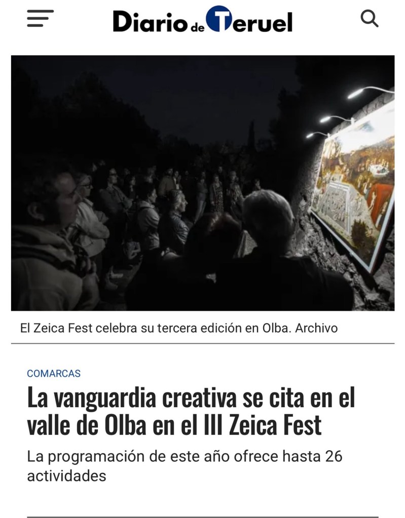 Vaya por delante que el ZeicaFest me parece una iniciativa fantástica que ojalá siga creciendo y cosechando éxitos .Además éstos no son los responsables . Somos la generación que ha conocido a La Fura dels Baus , por lo que mi queja no va por ahí sino por la permisividad del Alcalde de Olba a autorizar la realización de dicha performance dentro de la Ermita de San Roque de propiedad municipal . No se trata de ser creyente o no sino simplemente de respetar a nuestros mayores , las raíces , sus valores . En fin, supongo que debe ser otra forma más de marionetismo municipal . Aquí os dejo las capturas tanto de lo ocurrido en el interior de la Ermita como de lo relacionado con el ZeicaFest publicado en el Diario de Teruel para que cada un@ saque sus conclusiones.